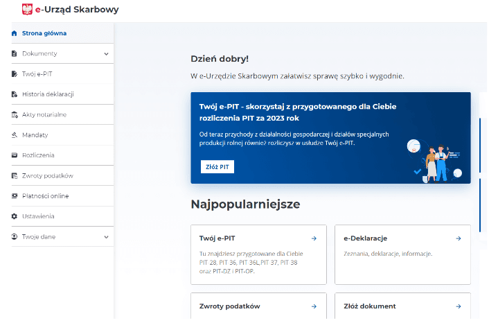 4. Po zalogowaniu się trafisz na stronę główną e-Urzędu Skarbowego: