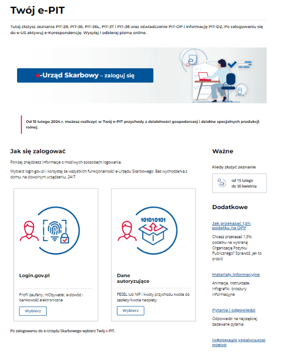 2. Kliknij w opcję „Otwórz e-PIT podatki.gov.pl”. Zostaniesz przekierowany(-na) na stronę portalu podatki.gov.pl, która wygląda tak: