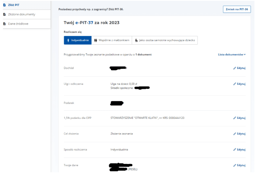 6. W polu „1,5% podatku dla OPP” pojawi się organizacja, na którą w poprzednim roku przekazałeś(-aś) 1,5 procent podatku. Jeśli chcesz zmienić organizację albo pole to jest puste – wybierz opcję „Edytuj”.