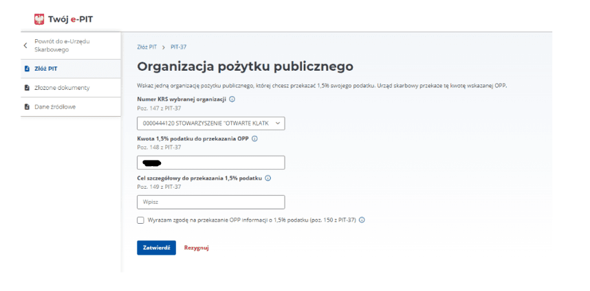 7. Wklej w pole „Numer KRS wybranej organizacji” skopiowany wcześniej numer KRS Stowarzyszenia Otwarte Klatki (dla przypomnienia: jest to 0000 444 120), a następnie kliknij „Zatwierdź”.