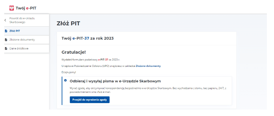 8. Następnie zaakceptuj zeznanie PIT i złóż PIT wysyłając formularz podatkowy. Po wysłaniu powinna wyświetlić się następująca informacja: