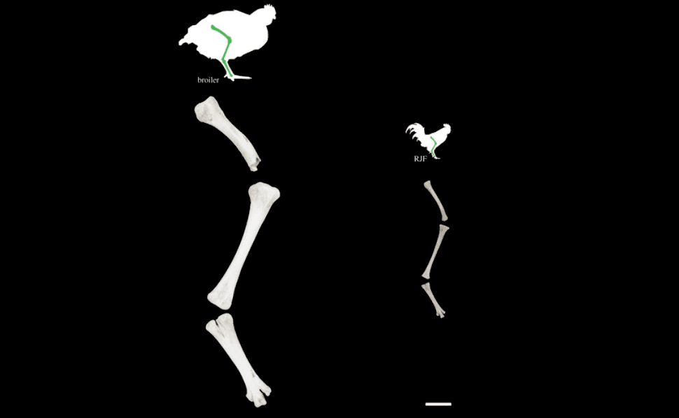 Współczesne szkielety brojlerów są znacznie większe niż szkielety ich przodków. Kurczaki nie tylko osiągają większą masę, ale też dużo szybciej rosną – tempo wzrostu brojlerów jest prawie trzykrotnie wyższe niż w przypadku ptaków z gatunku kur bankiwa. Najbardziej widoczne jest to, gdy porównamy długości kości kończyn dolnych młodych brojlerów i kur bankiwa w tym samym wieku. Kości brojlerów są około trzy razy szersze i dwa razy dłuższe! To niedojrzałe ptaki ze zbyt dużym, ciężkim, ale wciąż niedostatecznie rozwiniętym szkieletem. Ponadto, w wyniku tak szybkiego tempa wzrostu dochodzi do kulawizn, które nigdy nie były opisane w kościach ptaków badanych przez archeologów.