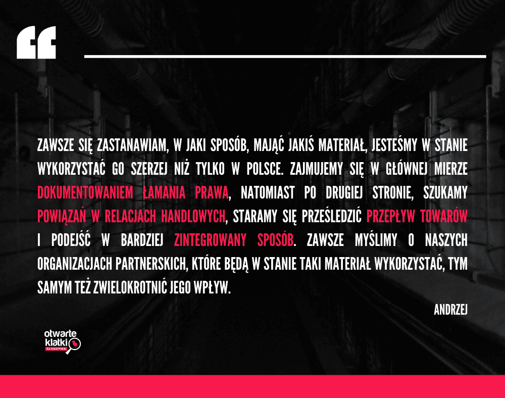 Jednym z etapów szukania informacji, jest również zbadanie powiązań gospodarczych i biznesowych. “Zawsze się zastanawiam, w jaki sposób, mając jakiś materiał, jesteśmy w stanie wykorzystać go szerzej niż tylko w Polsce. Zajmujemy się w głównej mierze dokumentowaniem łamania prawa, natomiast po drugiej stronie, szukamy powiązań w relacjach handlowych, staramy się prześledzić przepływ towarów i podejść do zebranych materiałów w bardziej zintegrowany sposób. Zawsze myślimy o naszych organizacjach partnerskich, które będą w stanie taki materiał wykorzystać, tym samym też zwielokrotnić jego wpływ.” - dodał Andrzej na podsumowanie swojej wypowiedzi.